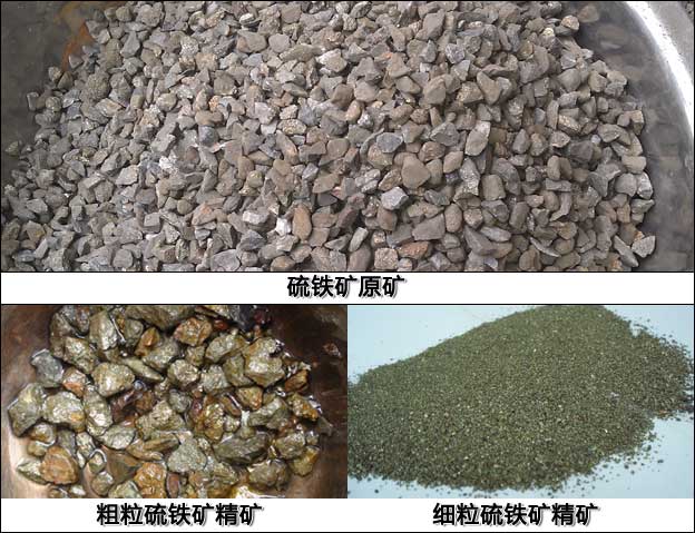我們首先來看一組硫鐵礦的照片,下圖中的上方為硫鐵礦原礦破碎后的照片,右下圖為細粒的硫精砂,左下圖為粗粒的硫鐵礦精礦,硫精砂和粗粒硫鐵礦精礦都是通過跳汰機重選所得。
